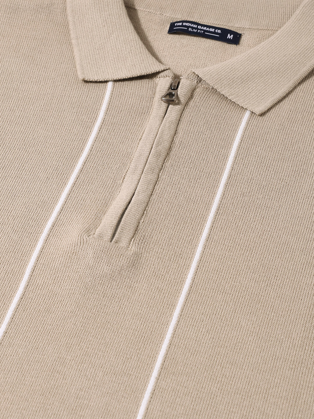 Men's Beige Slim Fit Striped Flat Knit Polo Collar T-Shirt