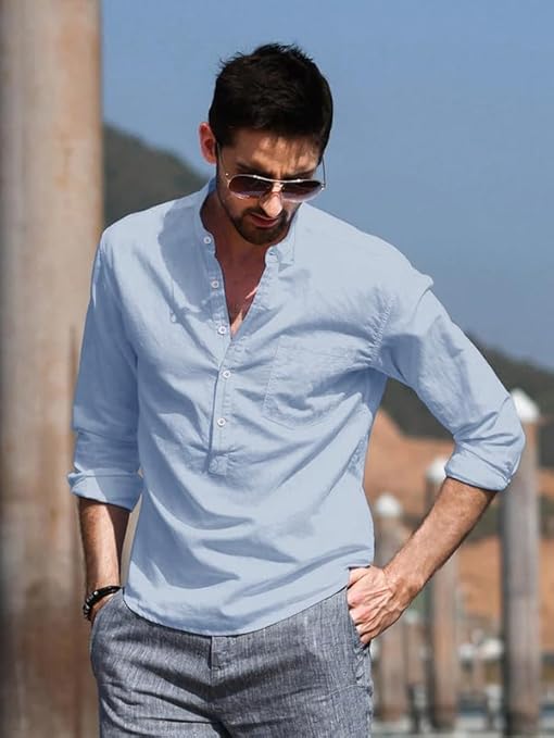 Add effortless charm to your wardrobe with this Sky Blue Mandarin Collar Shirt, designed for men who prefer modern minimal style. Featuring a smart band collar (Chinese collar) and half-button placket design, this shirt blends traditional elegance with contemporary fashion.