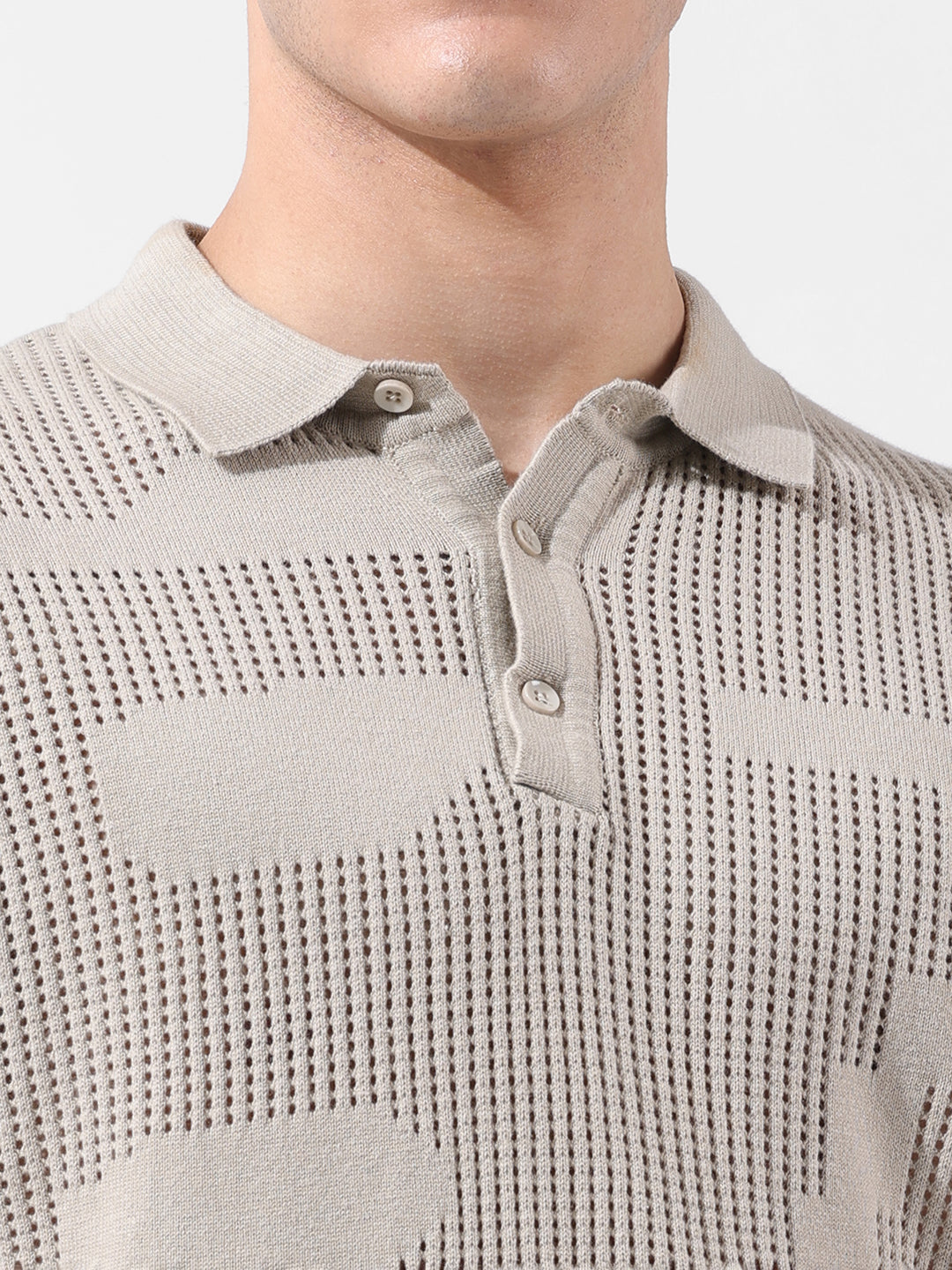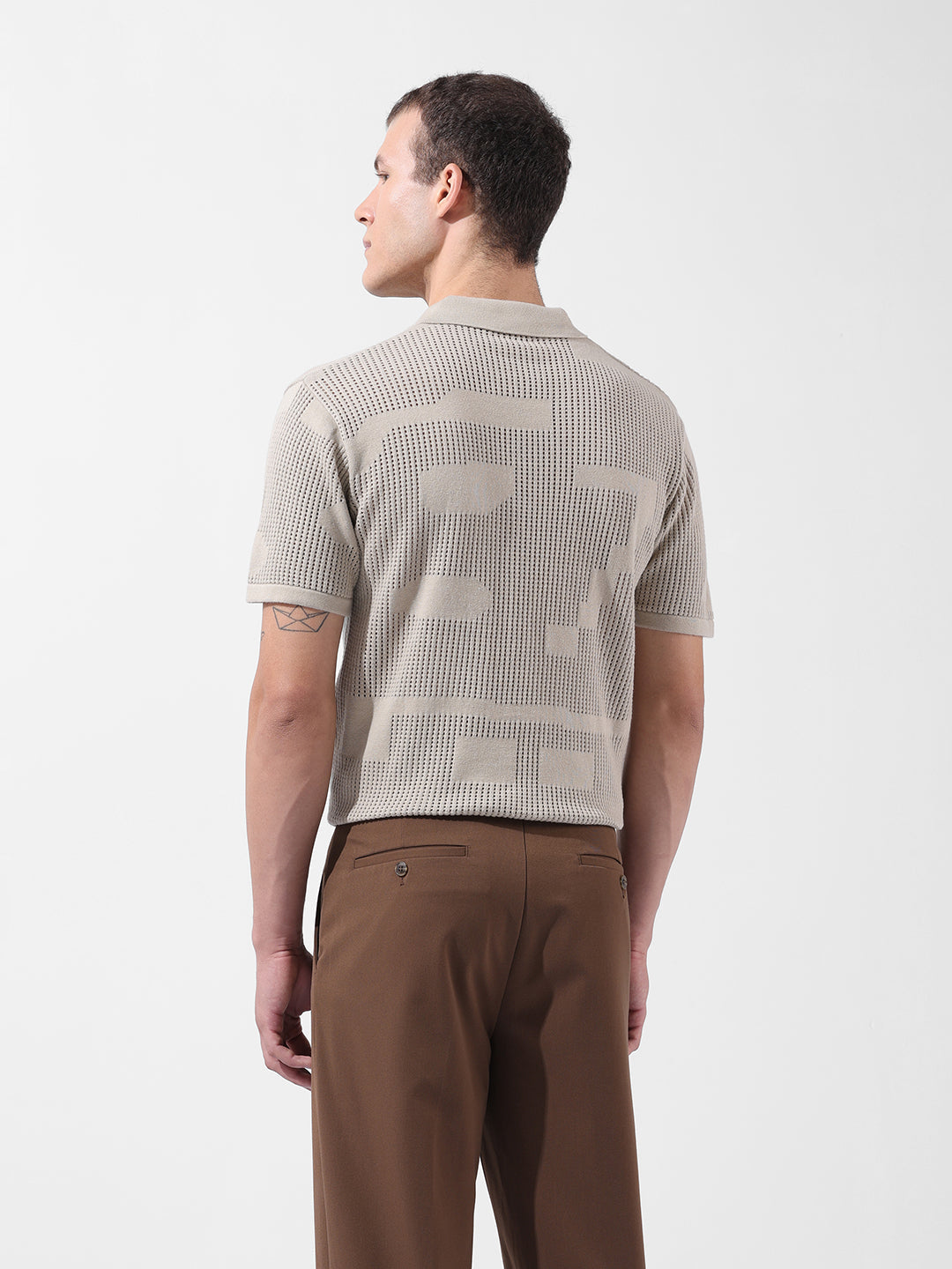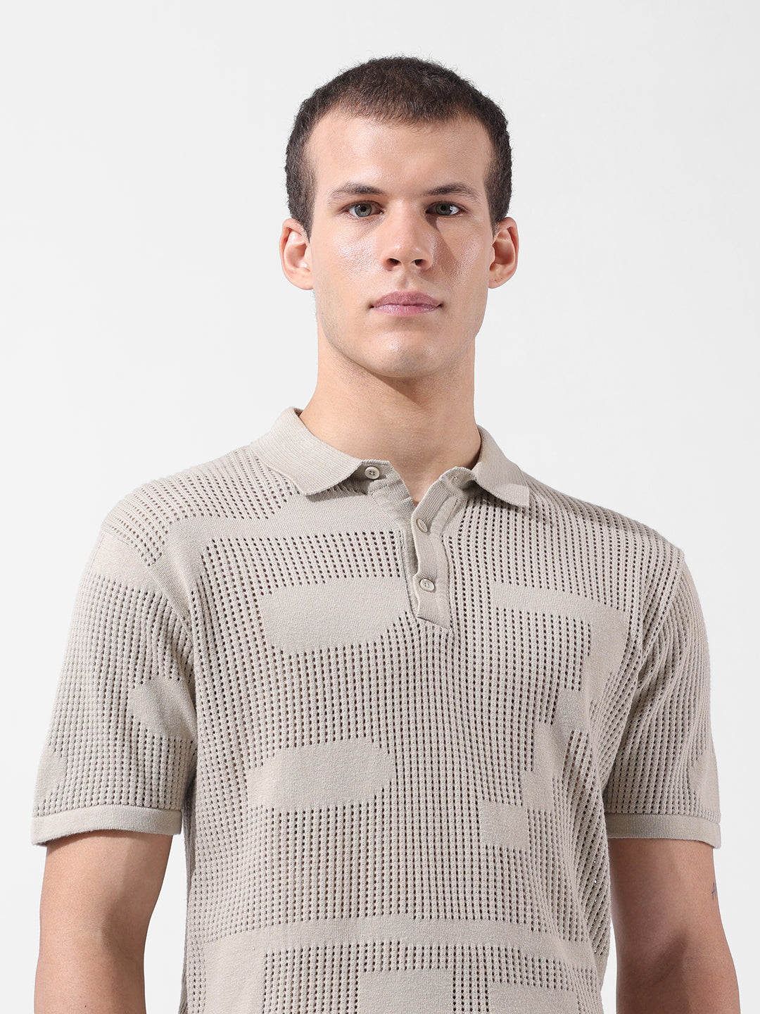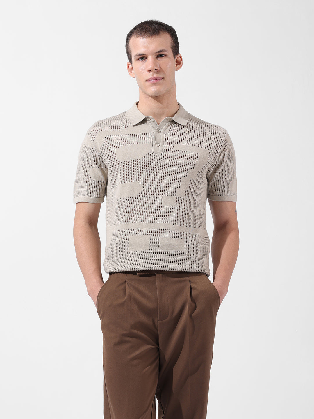 Men's Beige Slim Fit Textured Flat Knit Polo Collar T-Shirt